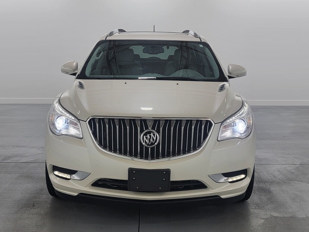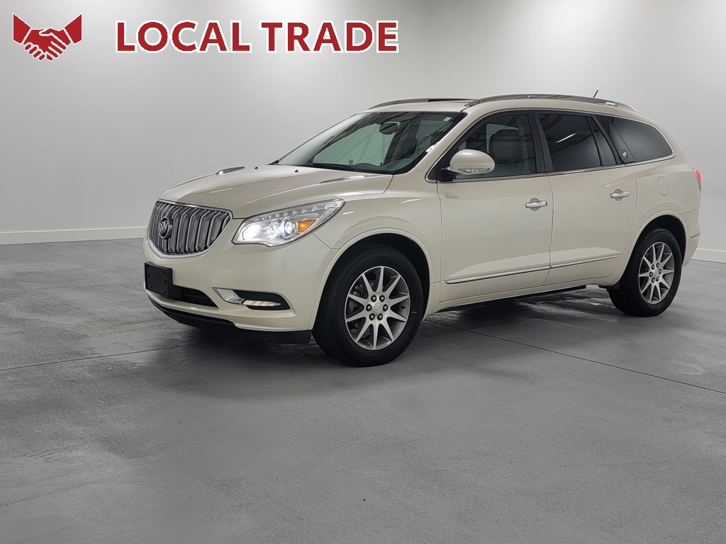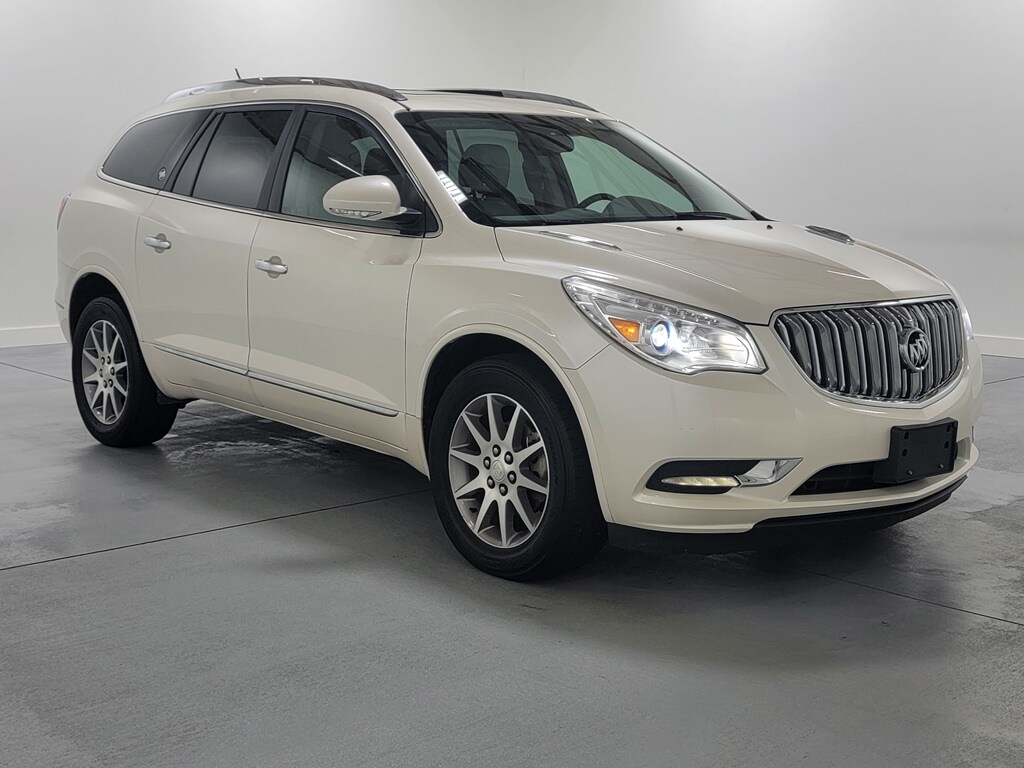 With Some Available Options Like 19" x 7.5" Aluminum (4) Wheels, 3.16 Axle Ratio, 3rd row seats: split-bench, 4-Wheel Disc Brakes, 6 Speakers, 7-Passenger Seating, 8-Way Power Driver Seat Adjuster, 8-Way Power Passenger Seat Adjuster, ABS brakes, Air Conditioning, Alloy wheels, AM/FM radio: SiriusXM, Auto-dimming Rear-View mirror, Automatic temperature control, Brake assist, Bumpers: body-color, CD player, Compass, Delay-off headlights, Driver door bin, Driver vanity mirror, Dual front impact airbags, Dual front side impact airbags, Electronic Stability Control, Emergency communication system: OnStar Directions & Connections, Exterior Parking Camera Rear, Four wheel independent suspension, Front anti-roll bar, Front Bucket Seats, Front Center Armrest w/Storage, Front dual zone A/C, Front reading lights, Fully automatic headlights, Garage door transmitter, Heated door mirrors, Heated Driver & Front Passenger Seats, Heated front seats, Heated Steering Wheel, Heated steering wheel, High intensity discharge headlights: Bi-Xenon, Illuminated entry, Leather steering wheel, Low tire pressure warning, Memory seat, Memory Settings, Occupant sensing airbag, Outside temperature display, Overhead airbag, Panic alarm, Passenger door bin, Passenger vanity mirror, Perforated Leather-Appointed Seat Trim, Power door mirrors, Power driver seat, Power Liftgate, Power passenger seat, Power steering, Power windows, Radio data system, Radio: Color Touch AM/FM/CD w/IntelliLink, Rear air conditioning, Rear anti-roll bar, Rear Parking Sensors, Rear reading lights, Rear window defroster, Rear window wiper, Remote keyless entry, Roof rack: rails only, Security system, Side Blind Zone Alert w/Cross Traffic Alert, SiriusXM Satellite Radio, Speed control, Speed-sensing steering, Spoiler, Steering wheel mounted audio controls, Tachometer, Telescoping steering wheel, Tilt steering wheel, Traction control, Trip computer, Turn signal indicator mirrors, Variably intermittent wipers, and Voltmeter. White Diamond Clearcoat 2015 Buick Enclave Leather Group 4D Sport Utility 3.6L V6 SIDI VVT 17/24 City/Highway MPG FWD Automatic