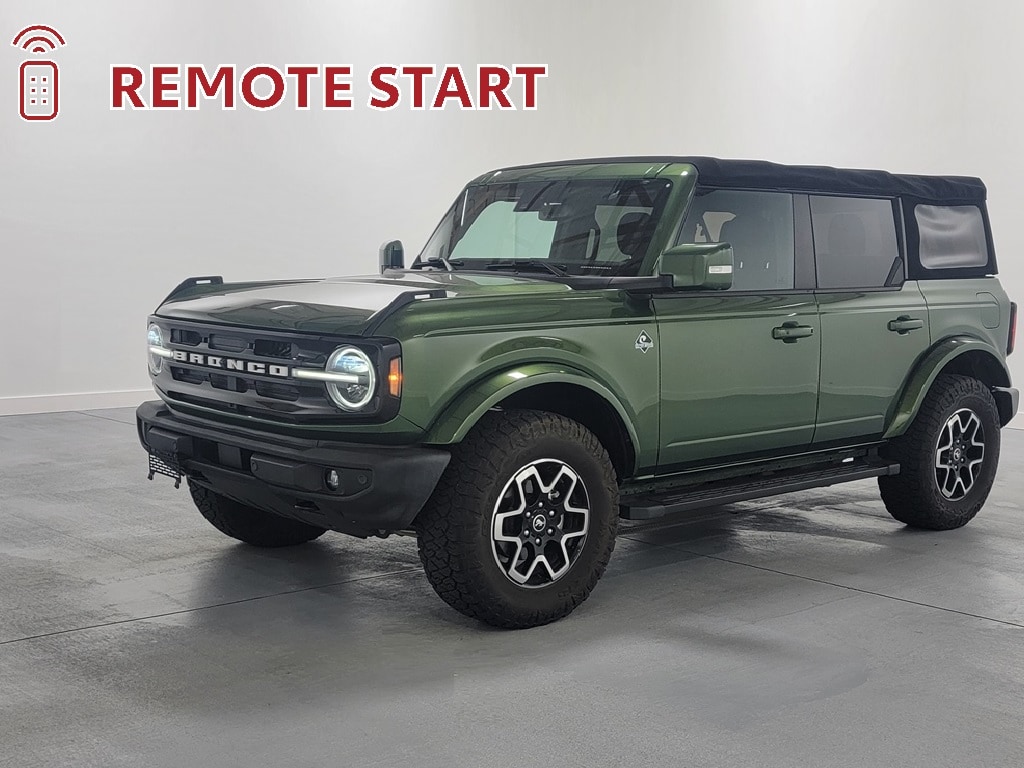 With Some Available Options Like 4-Wheel Disc Brakes, 6 Speakers, ABS brakes, Air Conditioning, AM/FM radio: SiriusXM with 360L, AM/FM Stereo, Auto High-beam Headlights, Brake assist, Compass, Delay-off headlights, Driver door bin, Driver vanity mirror, Dual front impact airbags, Dual front side impact airbags, Electronic Stability Control, Emergency communication system: 911 Assist, Exterior Parking Camera Rear, Front & Rear Floor Liners w/o Carpet Floor Mats, Front anti-roll bar, Front Bucket Seats, Front Center Armrest, Front License Plate Bracket, Front reading lights, Front wheel independent suspension, Fully automatic headlights, Heated door mirrors, Illuminated entry, Integrated roll-over protection, Low tire pressure warning, Occupant sensing airbag, Outside temperature display, Overhead airbag, Overhead console, Panic alarm, Passenger door bin, Passenger vanity mirror, Power door mirrors, Power steering, Power windows, Radio data system, Remote keyless entry, Security system, SiriusXM Radio w/360L, Speed control, Split folding rear seat, Steering wheel mounted audio controls, SYNC 4, Tachometer, Telescoping steering wheel, Tilt steering wheel, Traction control, Trip computer, and Variably intermittent wipers. Green Metallic 2022 Ford Bronco Outer Banks 4D Sport Utility 2.3L EcoBoost I-4 20/21 City/Highway MPG 4WD Automatic
