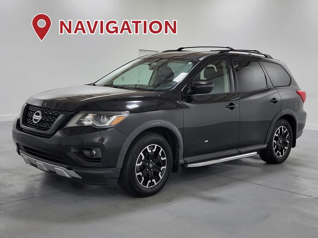With Some Available Options Like Rock Creek Edition (Black Door Handles, Black License Plate Finisher, Black Mesh Grille & V-Motion, Black Molded Over Fenders, Black Outside Rearview Mirrors, Black Roof Rails, Front Aesthetic Silver Skid Plate, Premium Metallic Interior Trim, Splash Guards, Trailer Tow Hitch & Harness, Unique Front Door Badging, Unique Rock Creek Edition Seating Surfaces, and Wheels: 18" Unique Dark), SV Rock Creek Edition Technology Package (DISC) (Heated Front Cloth Seats, Heated Outside Rear-View Mirrors, Heated Steering Wheel, NissanConnect Services Powered by SiriusXM, NissanConnect w/Navigation & Services, and SiriusXM Traffic), 3rd row seats: bench, 4-Wheel Disc Brakes, 5.25 Axle Ratio, 6 Speakers, ABS brakes, Air Conditioning, Alloy wheels, AM/FM radio: SiriusXM, Auto-dimming Rear-View mirror, Automatic temperature control, Blind Spot Warning, Brake assist, Bumpers: body-color, CD player, Cloth Seating Surfaces, Compass, Delay-off headlights, Driver door bin, Driver vanity mirror, Dual front impact airbags, Dual front side impact airbags, Electronic Stability Control, Four wheel independent suspension, Front anti-roll bar, Front Bucket Seats, Front Center Armrest, Front dual zone A/C, Front fog lights, Front reading lights, Fully automatic headlights, Garage door transmitter: HomeLink, Illuminated entry, Leather Shift Knob, Leather steering wheel, Low tire pressure warning, Occupant sensing airbag, Outside temperature display, Overhead airbag, Overhead console, Panic alarm, Passenger door bin, Passenger vanity mirror, Power door mirrors, Power driver seat, Power steering, Power windows, Radio data system, Radio: AM/FM/CD Audio System w/NissanConnect, Rear air conditioning, Rear anti-roll bar, Rear Parking Sensors, Rear reading lights, Rear seat center armrest, Rear window defroster, Rear window wiper, Reclining 3rd row seat, Remote keyless entry, Rock Creek Edition Cross Bars, Rock Creek Floor & Cargo Mats, Security system, Speed control, Speed-sensing steering, Speed-Sensitive Wipers, Split folding rear seat, Spoiler, Steering wheel mounted audio controls, Tachometer, Telescoping steering wheel, Tilt steering wheel, Traction control, Trip computer, Turn signal indicator mirrors, Variably intermittent wipers, and Wheels: 18" x 7.5 J Machined Aluminum-Alloy. Magnetic Black Pearl 2020 Nissan Pathfinder SV 4D Sport Utility V6 20/27 City/Highway MPG FWD Automatic