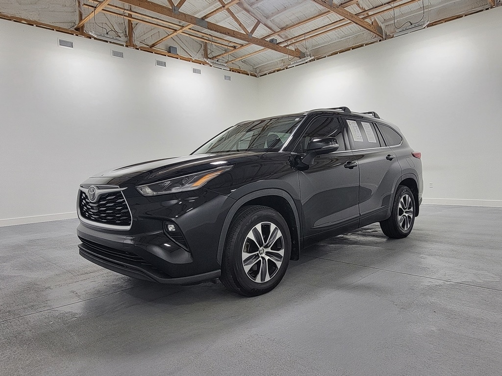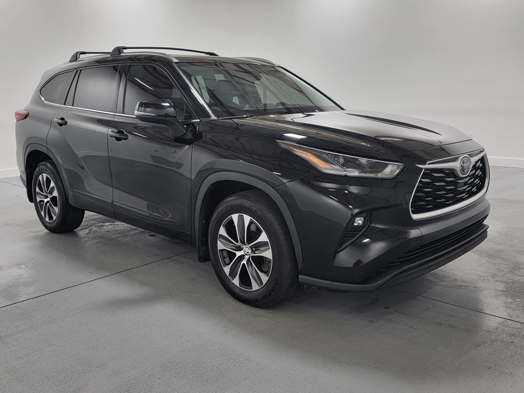 With Some Available Options Like 18" Machined Alloy Wheels, 3.003 Axle Ratio, 3rd row seats: split-bench, 4-Wheel Disc Brakes, 6 Speakers, ABS brakes, Air Conditioning, Alloy wheels, AM/FM radio: SiriusXM, Apple CarPlay/Android Auto, Auto High-beam Headlights, Auto-dimming Rear-View mirror, Automatic temperature control, Brake assist, Bumpers: body-color, Delay-off headlights, Driver door bin, Driver vanity mirror, Dual front impact airbags, Dual front side impact airbags, Electronic Stability Control, Emergency communication system: Safety Connect with 1-year trial, Exterior Parking Camera Rear, Four wheel independent suspension, Front anti-roll bar, Front Bucket Seats, Front Center Armrest, Front dual zone A/C, Front fog lights, Front reading lights, Fully automatic headlights, Garage door transmitter: HomeLink, Heated door mirrors, Heated Front Bucket Seats, Heated front seats, Illuminated entry, Knee airbag, Leather Shift Knob, Low tire pressure warning, Occupant sensing airbag, Outside temperature display, Overhead airbag, Overhead console, Panic alarm, Passenger door bin, Passenger vanity mirror, Power door mirrors, Power driver seat, Power Liftgate, Power moonroof, Power passenger seat, Power steering, Power windows, Radio: Audio Plus, Rear air conditioning, Rear anti-roll bar, Rear reading lights, Rear window defroster, Rear window wiper, Reclining 3rd row seat, Remote keyless entry, Roof rack: rails only, Security system, SofTex Seat Trim, Speed control, Speed-sensing steering, Split folding rear seat, Spoiler, Steering wheel mounted audio controls, Tachometer, Telescoping steering wheel, Tilt steering wheel, Traction control, Trip computer, Turn signal indicator mirrors, and Variably intermittent wipers. Black 2021 Toyota Highlander XLE 4D Sport Utility 3.5L V6 DOHC 20/27 City/Highway MPG AWD Automatic