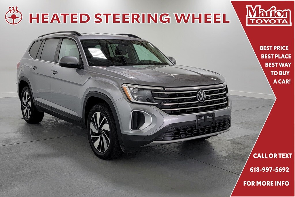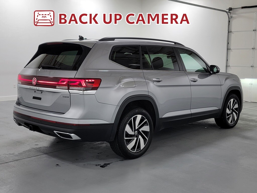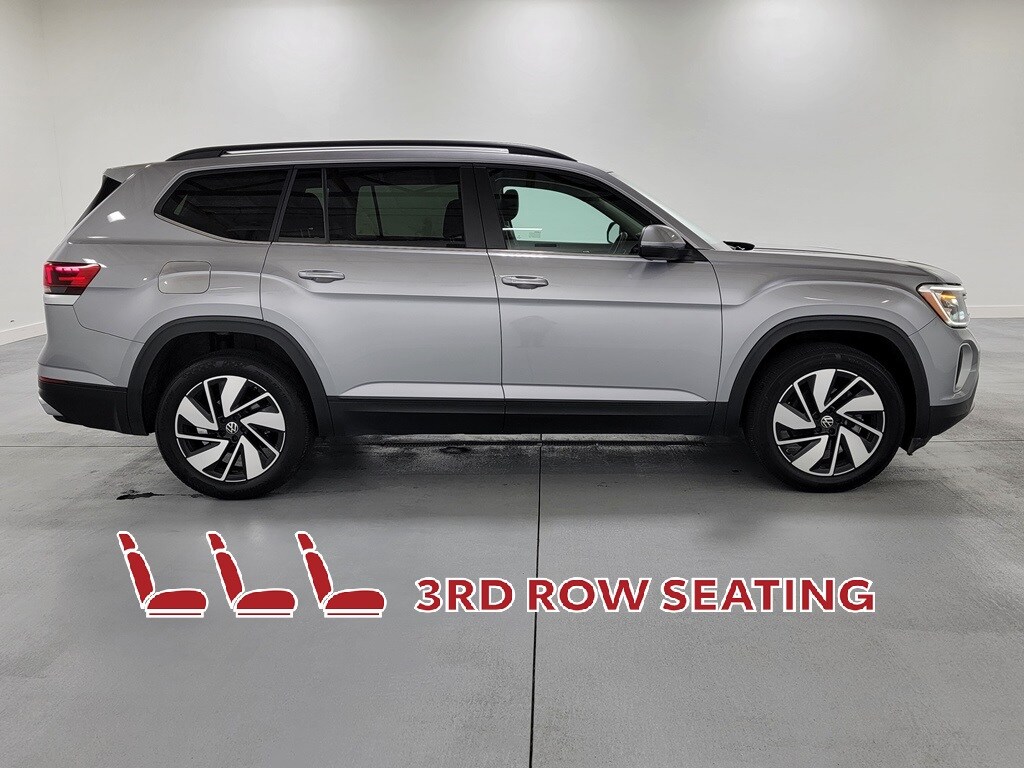 Recent Arrival! With Some Available Options Like 3.60 Axle Ratio, 3rd row seats: split-bench, 4-Wheel Disc Brakes, 6 Speakers, ABS brakes, Air Conditioning, Alloy wheels, AM/FM radio: SiriusXM with 360L, Auto-dimming Rear-View mirror, Automatic temperature control, Brake assist, Bumpers: body-color, Compass, Delay-off headlights, Driver door bin, Driver vanity mirror, Dual front impact airbags, Dual front side impact airbags, Electronic Stability Control, Emergency communication system: VW Car-Net Safe & Secure 5-year, Exterior Parking Camera Rear, Four wheel independent suspension, Front anti-roll bar, Front Bucket Seats, Front Center Armrest, Front dual zone A/C, Front fog lights, Front reading lights, Fully automatic headlights, Heated door mirrors, Heated front seats, Heated steering wheel, Heated/Actively Ventilated Front Bucket Seats, Illuminated entry, Low tire pressure warning, Occupant sensing airbag, Outside temperature display, Overhead airbag, Overhead console, Panic alarm, Passenger door bin, Passenger vanity mirror, Perforated V-Tex Leatherette Seating Surfaces, Power door mirrors, Power driver seat, Power Liftgate, Power steering, Power windows, Radio data system, Radio: MIB3 Composition Media, Rain sensing wipers, Rear air conditioning, Rear anti-roll bar, Rear reading lights, Rear seat center armrest, Rear window defroster, Rear window wiper, Remote keyless entry, Security system, Speed control, Speed-sensing steering, Split folding rear seat, Spoiler, Standard Suspension, Steering wheel mounted audio controls, Tachometer, Telescoping steering wheel, Tilt steering wheel, Traction control, Trip computer, Turn signal indicator mirrors, Variably intermittent wipers, Ventilated front seats, and Wheels: 20" 2-Tone Machined Alloy. Silver 2024 Volkswagen Atlas 2.0T SE w/Technology 4D Sport Utility 2.0L TSI 19/26 City/Highway MPG AWD Automatic