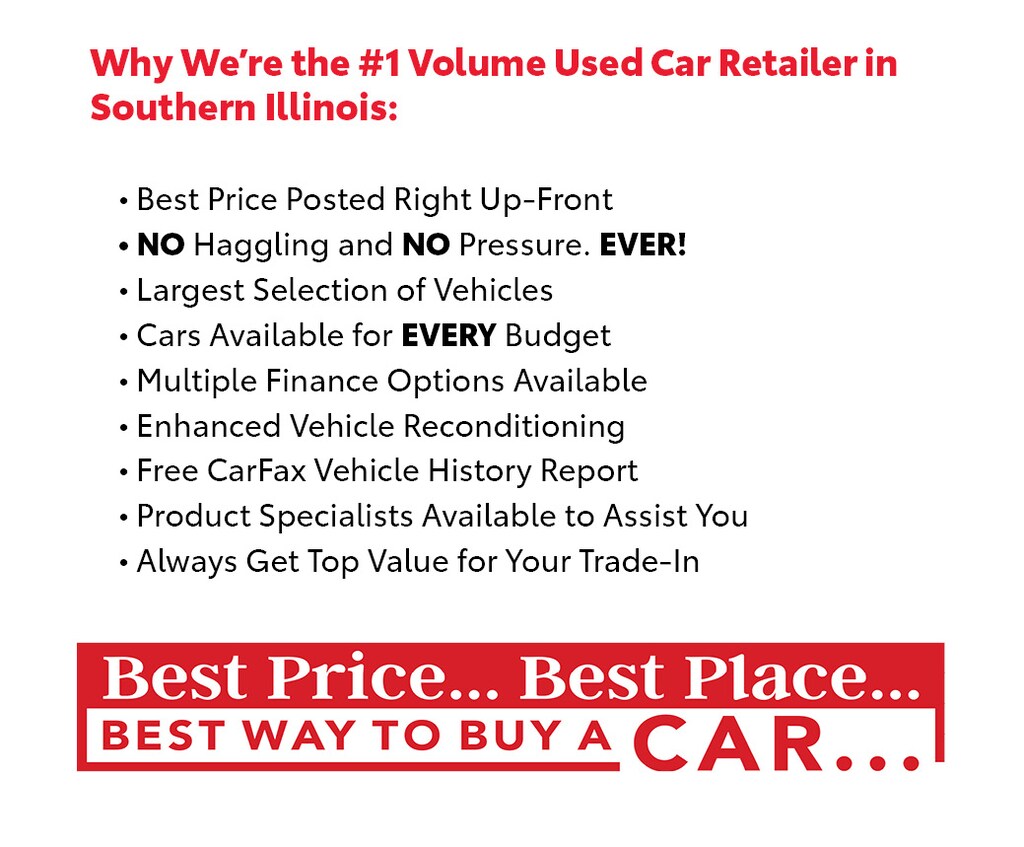 Marion Toyota offers the Best Price, Best Place and Best Way to Buy a Car. We think that every customer's time is valuable and their time should be respected. Whether they are an 18 year old buying their first vehicle, or a prominent business person who has been buying vehicles for years, everyone is entitled to our best price right upfront when purchasing a vehicle. At Marion Toyota, we won't make you endure the endless back and forth negotiations and haggling that many people associate with buying a car. The internet is a huge source of our business and we realize that to attract customers, we need to have an aggressive, competitive price right up front. On the lot or online, our first price...our only price, is always our Best Price. More customers in Southern Illinois choose Marion Toyota, The Used Car Auto Giant, over anyone else when purchasing an used car.. Customers from Carbondale, Herrin, Carterville, West Frankfort, Benton, Harrisburg know they can count on Marion Toyota for great selection, fast credit approval, low payments, cars under 5K and cars under 10K. Even customers from Paducah, Cape Girardeau and Mount Vernon make the short drive to Marion every day and purchase an used car.